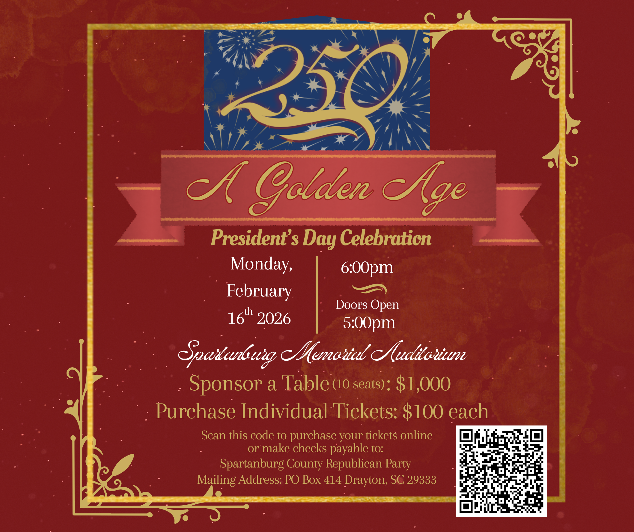 SPONSOR A TABLE: $1,000 SPONSORSHIPS AVAILABLE FOR A 10 SEAT TABLE If you are interested in individual tickets or have any questions, please contact us at info@spartanburggop.com For more information and questions, please call 864-590-7723. Payments are now set up to be payable via the online link below: